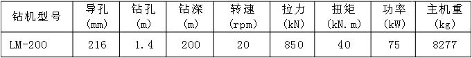 (4)鉆具 鉆具包括φ216mm導孔鉆頭、φ1.4m擴孔鉆頭、φ2.0m擴孔鉆頭(因為φ2.0m擴孔鉆頭比φ1.4m鉆頭一邊只大30cm,且鉆頭較重、鉆進速度較慢,所以一般不采用。)、鉆桿(開孔鉆桿、穩(wěn)定鉆桿和普通鉆桿)等。在斜井施工中,為減少阻力,使用φ1.4m擴孔鉆頭更為有效。 3.3 施工技術(shù)參數(shù) (1)我局豎井、斜井施工設(shè)備選取的反井鉆機機型為LM-200型。詳細參數(shù)見表3-1、表3-2。