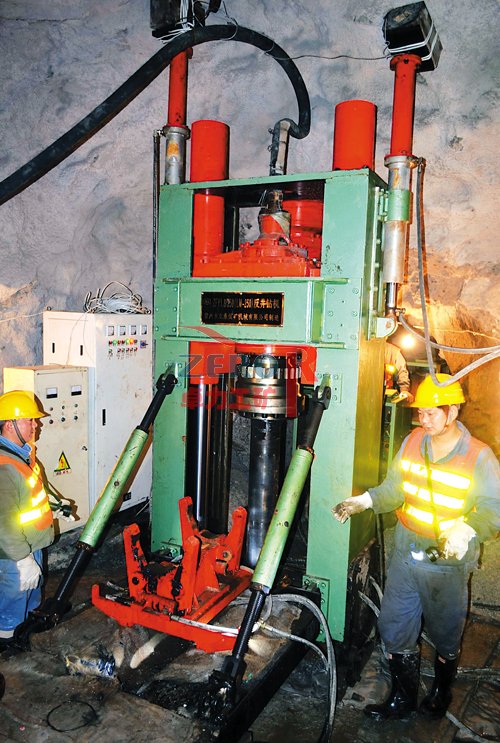 而使用反井鉆機(jī)則是先由上往下鉆一個(gè)先導(dǎo)孔,然后在下水平巷道卸去先導(dǎo)孔鉆頭,安裝上擴(kuò)孔鉆頭,再由下往上擴(kuò)孔,直到把擴(kuò)孔鉆頭打到上水平,完成一次性反井施工,是一種機(jī)械化程度高、安全高效的反井施工方法,具有減輕勞動(dòng)強(qiáng)度、作業(yè)效率高、施工安全可靠、成井質(zhì)量好等優(yōu)點(diǎn)。
